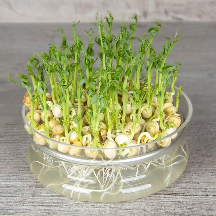 Voor het kweken van deze kiemgroente is een kiemschaaltje met rooster zeer geschikt. Vul het schaaltje met kraanwater tot iets boven het rooster en verdeel de erwten gelijkmatig. De zaden mogen deels in het water liggen, omdat ze veel vocht opnemen en duidelijk in volume toenemen.
