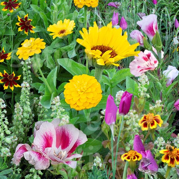 Samenstelling: Tagetes ‘Ehrenlegion’, Zinnia ‘Liliput Kanariengelb’, Clarkia ‘Azaleenschau’ , slaapmutsje ‘Karminkönig’ , Coreopsis ‘Goldstrahl’, Calendula ‘Princess Golden Black Center’, Reseda ‘Machet’