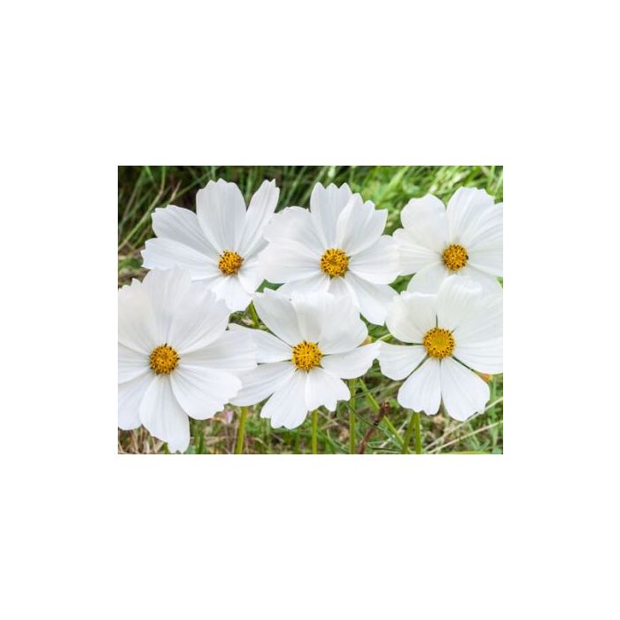 Een middelhoge cosmos met prachtige, zuiver witte, grote bloemen. De planten hebben fijn geveerd blad en groeien ook in de breedte, dus ze hebben wat ruimte nodig in de border. Uitstekend in perken en als vulplant in gemengde borders.