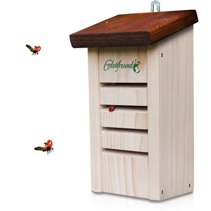 Het lieveheersbeestjehuisje met op de soort afgestemde invliegopeningen voor lieveheersbeestjes wordt voorgemonteerd geleverd in de Erdenfreund doos en kan snel en eenvoudig op elke hoogte en op elke locatie worden gemonteerd dankzij de voorgeboorde gaten in combinatie met een stevig ophangsysteem met metalen sleuven.