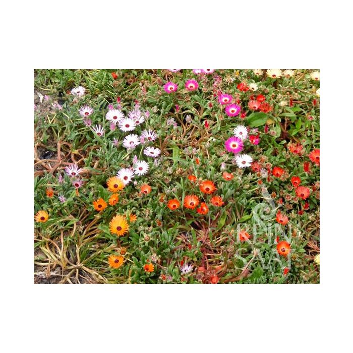 Vetplant. De plat spreidende plant verrukt met een bedwelmende kleurenzee met heldere bloemen in wit, roze, oranje en geel. Bloemdiameter ongeveer 5 cm. Bloeit van juli tot september. Groeihoogte ongeveer 15 cm. Lichtkiemer.