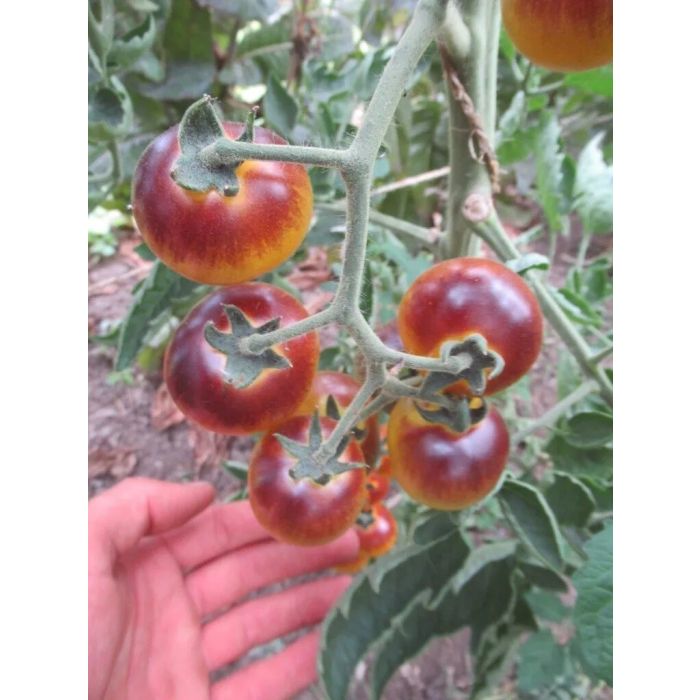 Deze soort levert trossen vol 2 cm grote kerstomaatjes in een goudgele tint en met een fris fruitige smaak. Extra zonlicht op de vruchten zorgt voor een ongewone diepe donkere tint.