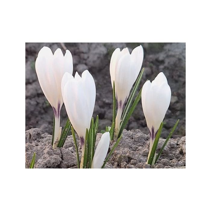 Crocus ‘Ice Queen’ is een elegante, middelgrote krokus met helderwitte bloemen en een subtiele blauwe basis rond het hart. De opvallende oranje meeldraden maken deze variëteit extra aantrekkelijk voor bijen en andere bestuivers. De bloemgrootte ligt tussen Crocus vernus en kleinere soorten zoals Crocus tommasinianus, wat wijst op een hybride oorsprong.