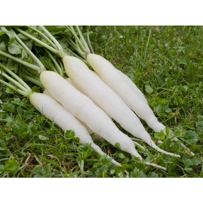 Cilindervormige, witte radijs, 10-12 cm lang, met kort loof. Snelle groei en robuust gewas. Mild kruidige smaak.