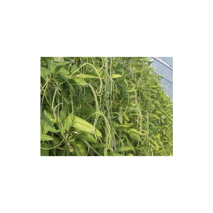 Warmteminnende kousenbandboon, voor kas of beschutte plaats. 50-60 cm lange peulen, best om de 2 dagen plukken.