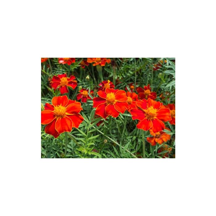 Aantrekkelijke, hooggroeiende Afrikaantjes met krachtige bladeren. Deze rechtopstaande Tagetes heeft mooie, rode, geelgerande bloemen en is een prachtige bloeier die bloemen
