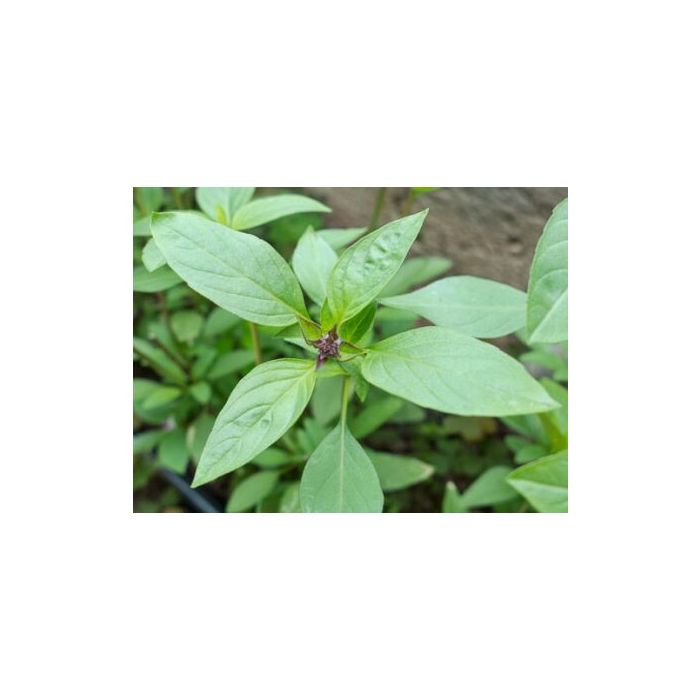 Laag groeiende basilicum met groene, licht paars getinte middelgrote bladeren. Donkerpaarse stengels en roze-paarse bloemen maken van Thaise basilicum ook een mooie sierplant voor warme locaties. De zoete smaak doet denken aan anijs.