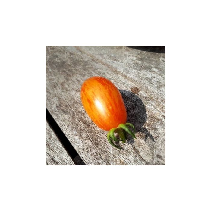 Ovaal-langwerpige vrucht, mooi geel-roze gestreept. Heel lekker en productief aan sterk groeiende planten.