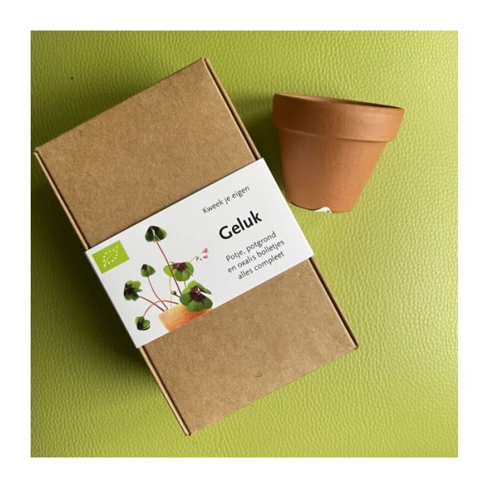 Met het All-in setje Geluksklaver kweek je eenvoudig je eigen geluk. De set bevat een terracotta potje, potgrond en vijf bolletjes Oxalis Iron Cross, bekend om hun vrolijke klavertje vier blaadjes. Deze meerjarige plant wordt ongeveer 10 cm hoog en voegt kleur en leven toe aan elk raam, balkon of bureau.