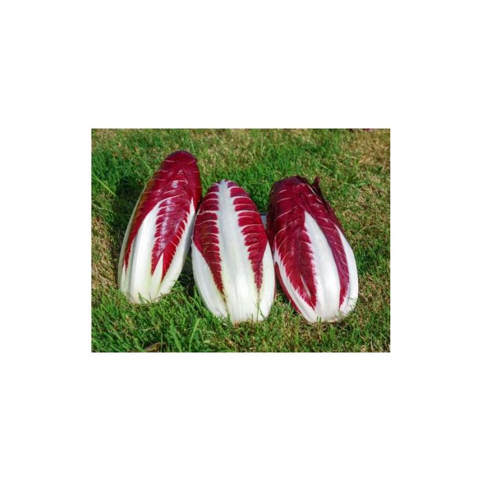 Compacte, langwerpige radicchio, 8 - 22 cm hoog. Dieprode kleur met brede, witte bladstelen.