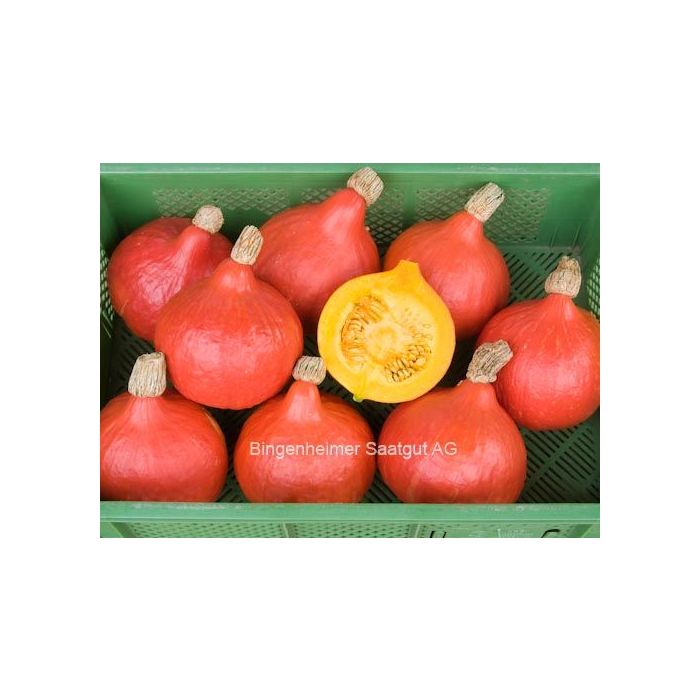 Rankende Hokkaido-pompoen. Breedrond oranje pompoen met gelig vruchtvlees. Vruchtgewicht gemiddeld 1,5 kg. Uniforme, ronde vorm. Bij oogst in september/oktober en goede oogst- en bewaartechniek houdbaar tot februari. DKG ca. 220 g. Optimale kieming boven 20°C en bij geringe temperatuurdaling ‘s nachts.