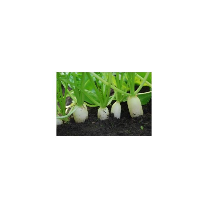 Cilindervormige, witte radijs, 10-12 cm lang, met kort loof. Snelle groei en robuust gewas. Mild kruidige smaak.