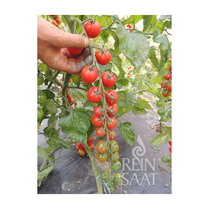 Cocktailtomaat met hoge opbrengst met vele rode zoet vruchten, zo groot als een kers, aan lange trossen. Diameter vrucht: ca. 2-3 cm. Duizenkorrelgewicht: 1 g
