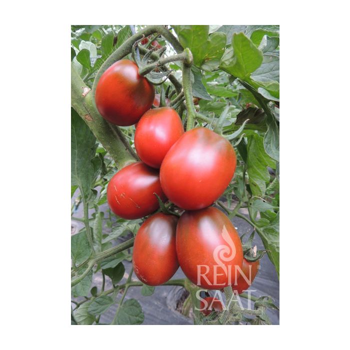 Gezonde, krachtige, middel- tot hoog groeiende sla tomaat met bruinrood-olijfkleurige, ovale, kleine vruchten.