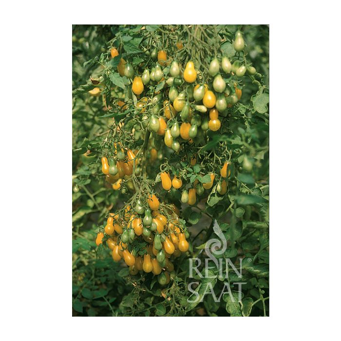 Een heel hoogproductieve variëteit met tot 100 vruchtdragende trossen. De kleine gele, ovaal-peervormige cocktailtomaten zijn populaire knabbeltomaten met hun zoet-aromatische, sappige vruchten. Stevig ras. Vruchtgewicht ca. 10 - 30 g. Voor buiten, kas en pot.