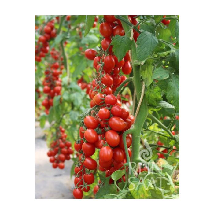 Veredeling ReinSaat. In testfase. Zaden voor proefteelt. Hoogproductieve, onbepaalde cocktailtomaat. Vormt enorm veel rode, ovaalronde tomaten aan dichte pluimen met een uitstekende, zoete, fruitige smaak. Stevige, stevige vruchten. Goede houdbaarheid in bewaring. Vruchtdiameter ongeveer 2 cm. Vruchtgewicht ongeveer 10 - 15 g.