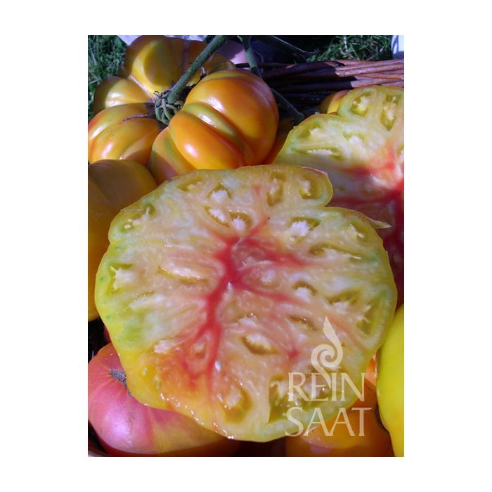 Zeer grote, breedronde vleestomaat met zeer sappige, goudgele vruchten. EHZ Reinsaat. Rood gevlamd vruchtvlees met een uitstekende smaak vanuit het midden van de vrucht. Vruchtgewicht ongeveer 300 - 700 g. Relatief vroeg afrijpende stoktomaat. Aanbevolen voor kasteelt of beschermde teelt. Teelt op twee niveaus mogelijk.