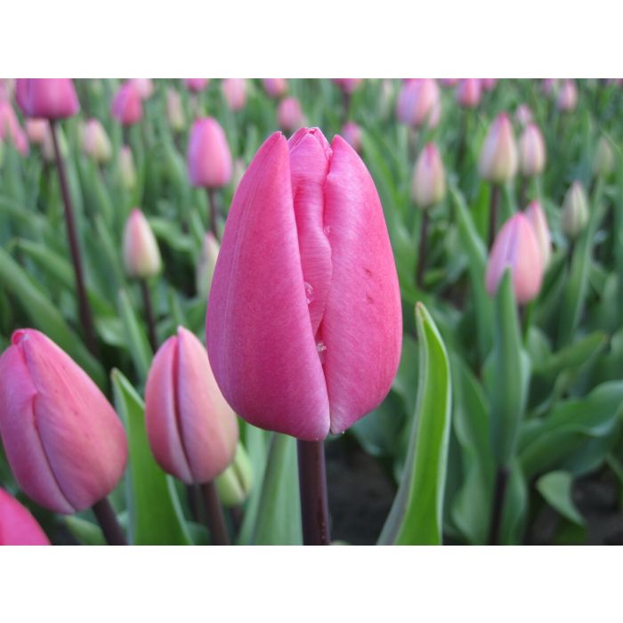 Een mooie zuurstokroze tulp met sterke middellange stelen die midden in de lente bloeien.
