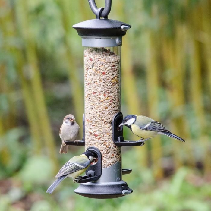 De unieke ventilatie-ring in het deksel voorkomt condensatie in de voedersilo, waardoor het voer langer vers blijft. De zitringen zorgen ervoor dat de vogels vanuit een natuurlijke houding (voorwaarts) kunnen eten. De afstand tussen de openingen zorgt er voor dat de vogels op voldoende afstand uit elkaar zitten, waardoor ze rustiger kunnen eten.
