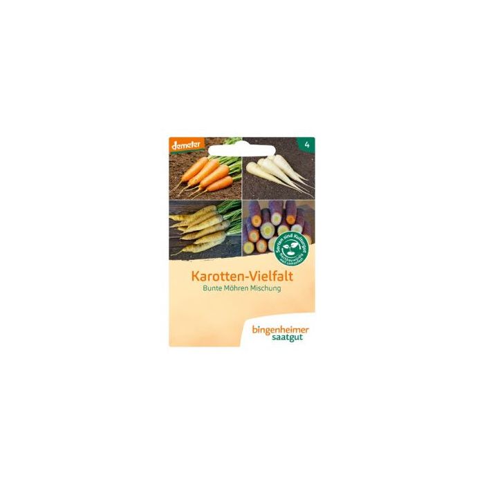 Een kleurrijk mengsel van Gelbe Gochsheimer (25%)*, Weiße Küttiger (25%)*, Oxhella (25%, oranje) en Soletta (25%, paars)* voor meer kleur en smaakvariatie op het bord. Wortelen houden van losse grond die niet snel dichtslibt. Als de grond zwaar is, kun je ze beter op ruggen telen. Tip: Geen verse mest! Kweek wortelen ten vroegste elke 4 jaar op dezelfde plek.