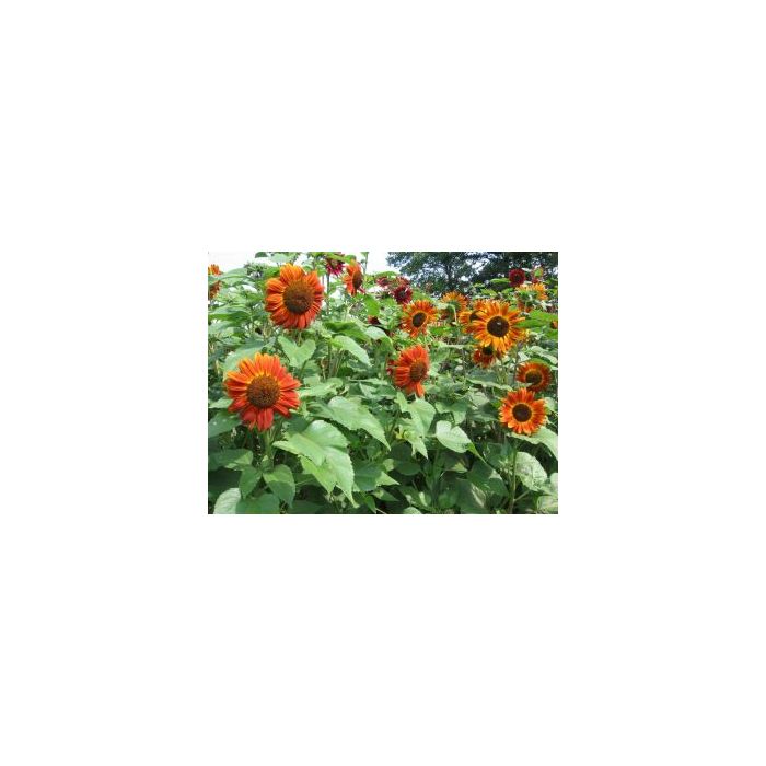 Een vertakte zonnebloem met middelgrote bloemen, in de kleuren; geel met rood en vaalrood tot donkerrood. Goede snijbloem en bijenplant.